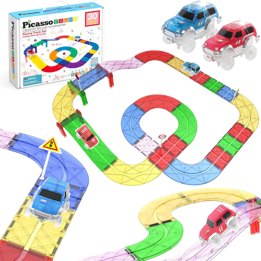 PicassoTiles Magnetic Tiles Race Track Car Thrilling Toy Playset Includes 2 Racing Trucks STEM Educational Magnet Tile Building Block Construction Set for Toddlers Boys Girls Ages 3 and Older PTR30