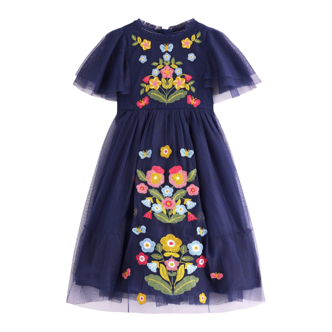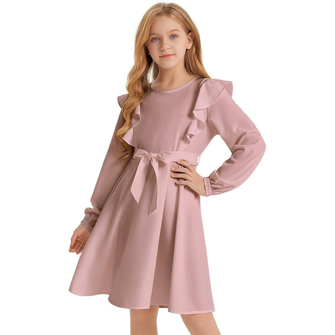 Quedoris Girls Ruffle Trim Dress Print and Solid Color A-line Swing Flared Belted Casual Party Dress with Zipper