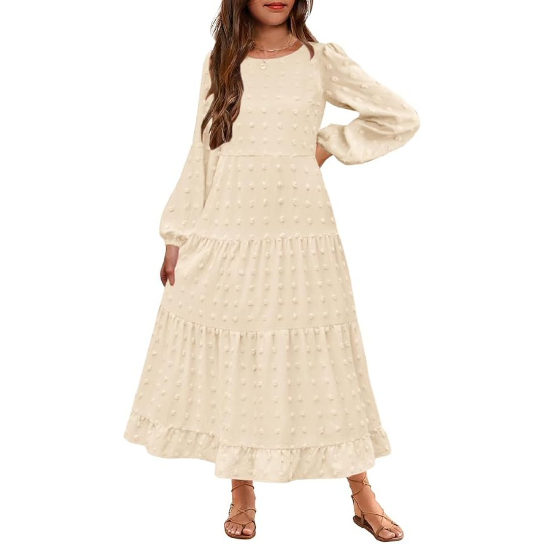 HOSIKA Girls Maxi Dress Long Sleeve Swiss Dot A Line Tiered Flowy Casual Party Dresses with Pockets